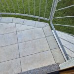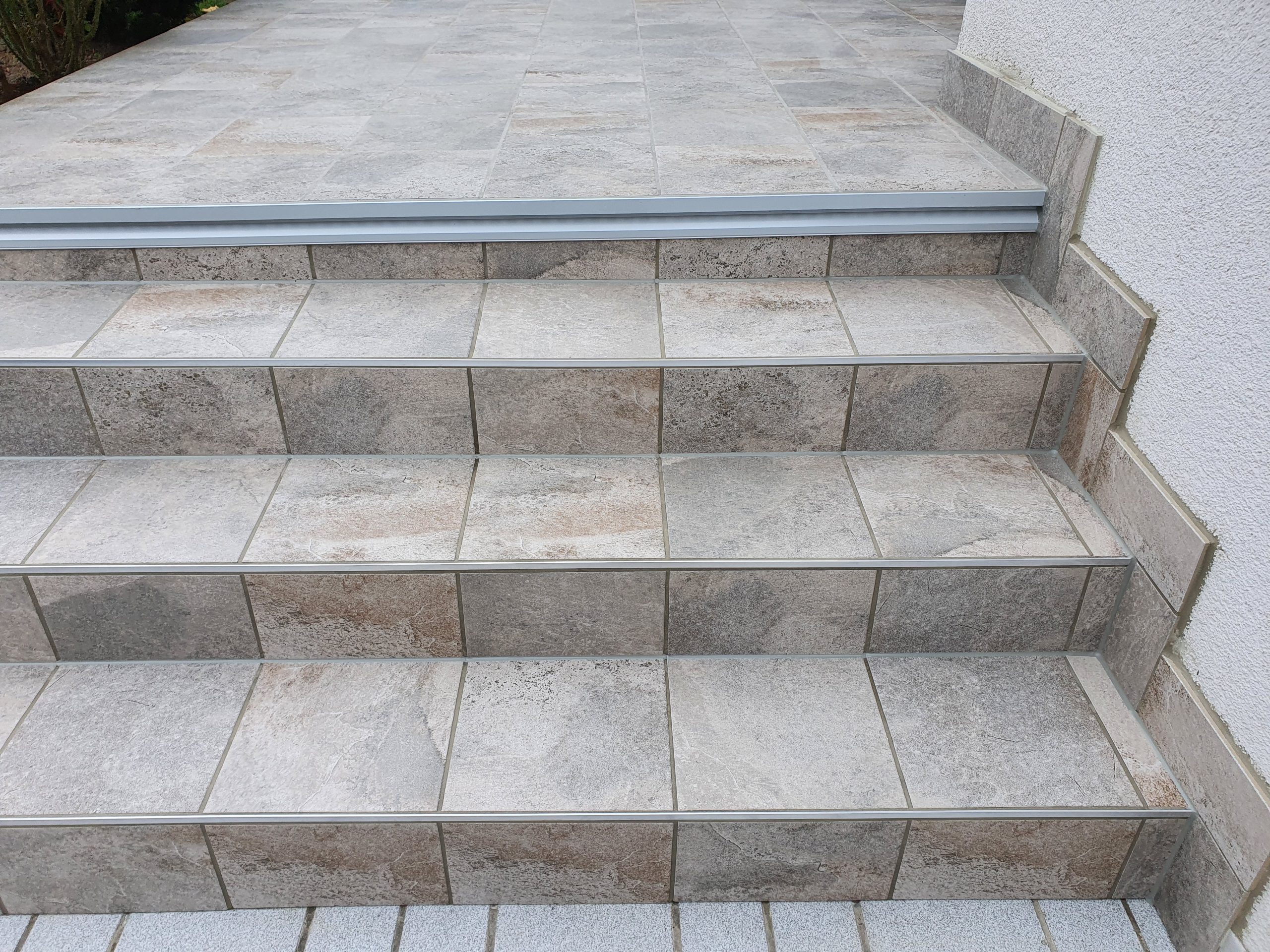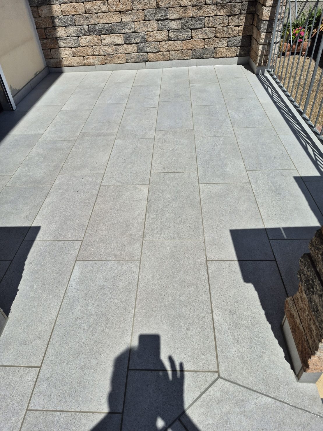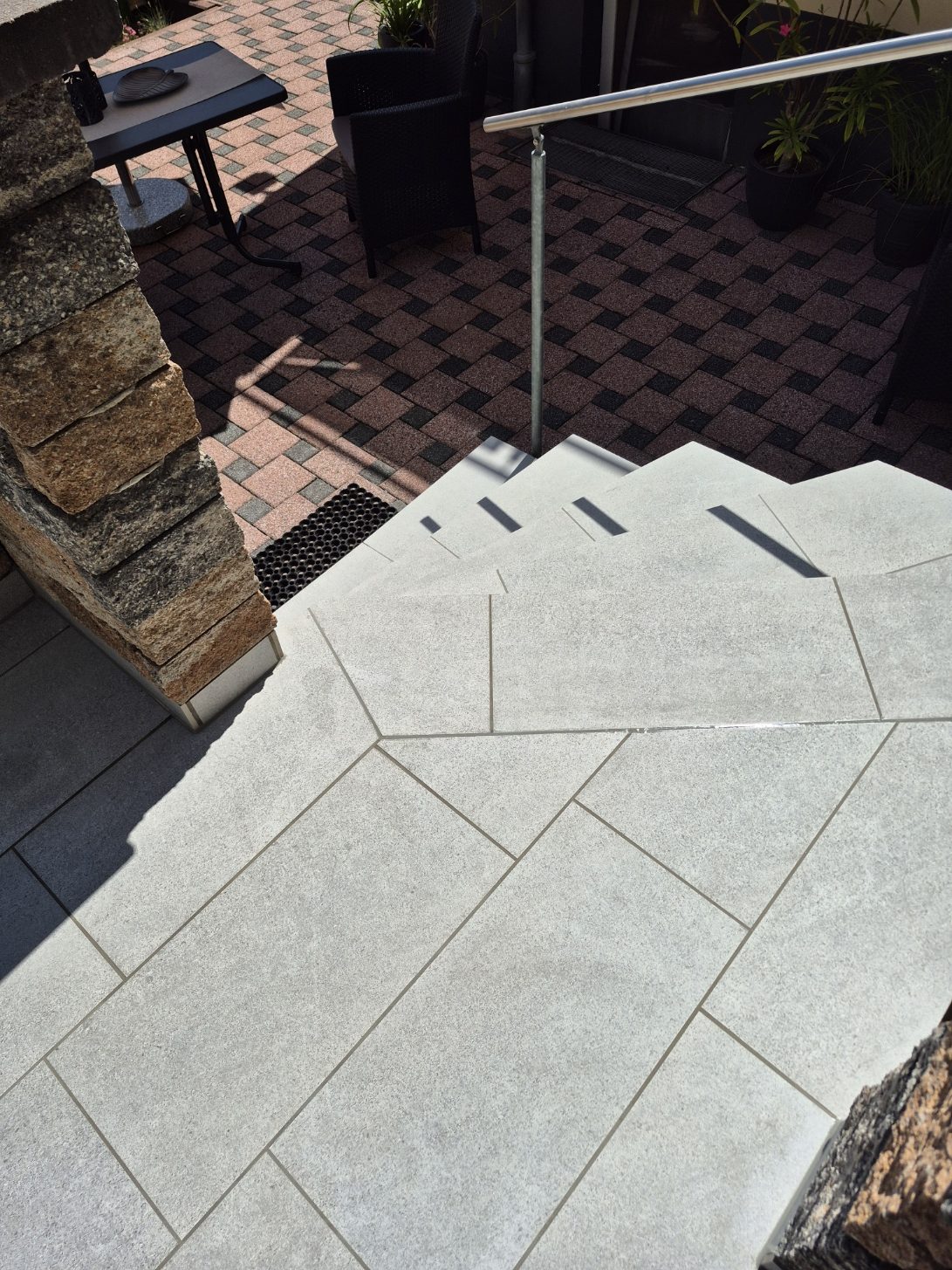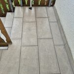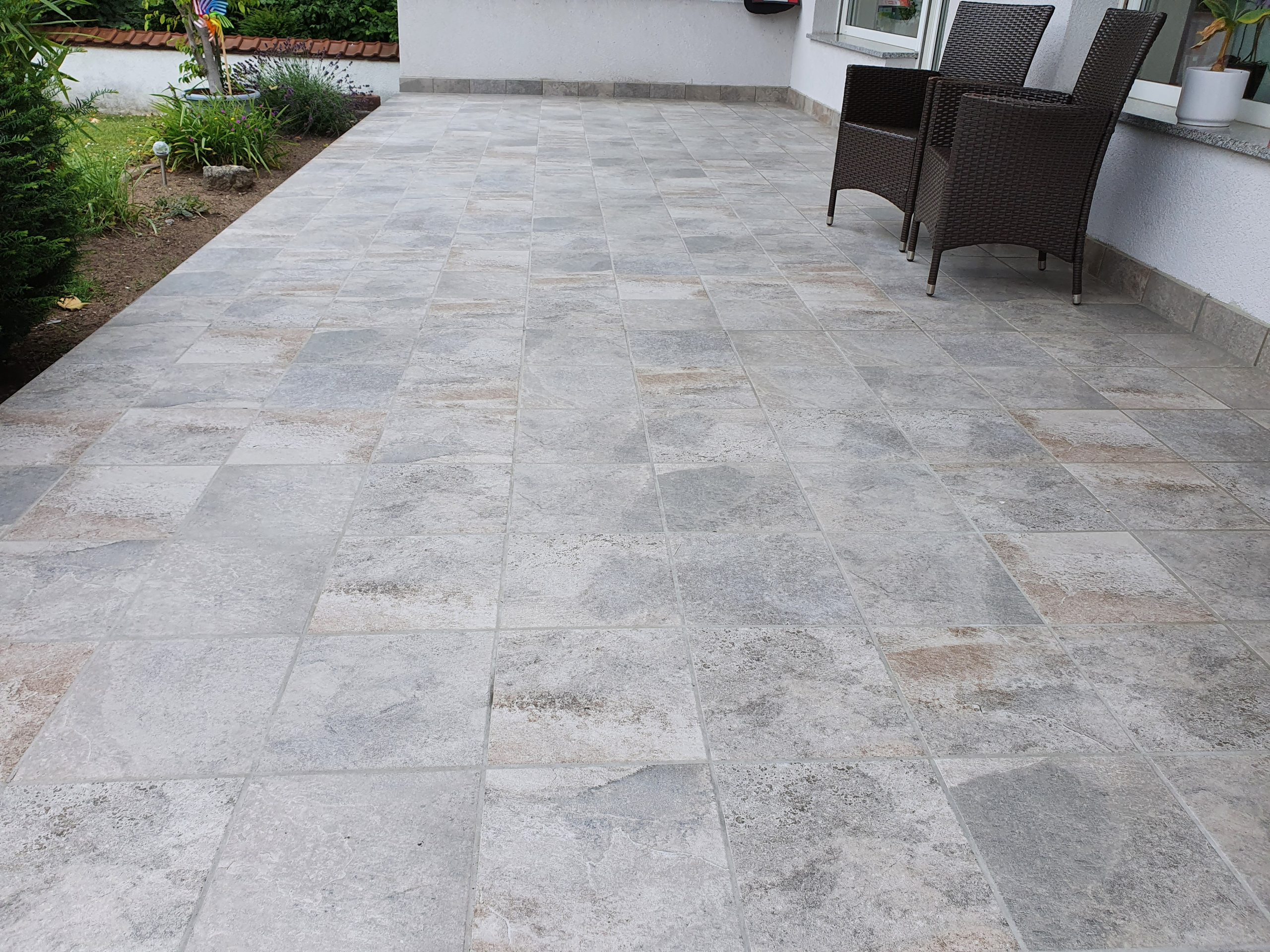 Die Terrassen haben einen Estrich verlegt bekommen mit einem Gefälle von 1,5% zur Abschlussschiene, über dem Estrich wurde eine Feuchtigkeitsabdichtung aufgetragen und im nächsten Arbeitsschritt wurde eine Drainagematte ausgelegt und zugeschnitten, die Platten wurden in Dünnbettmörtel direckt auf den Drainagenmatten geklebt. Der Anschluss den den Aluschienen wurde mit Silicon Abgedichtet.