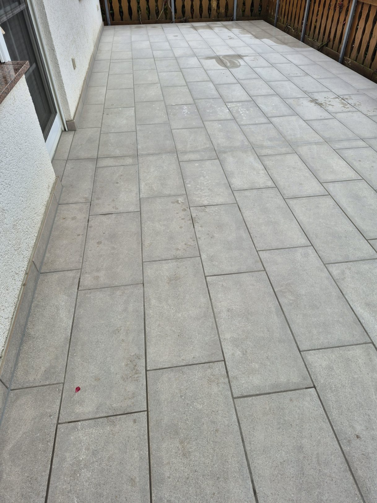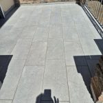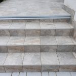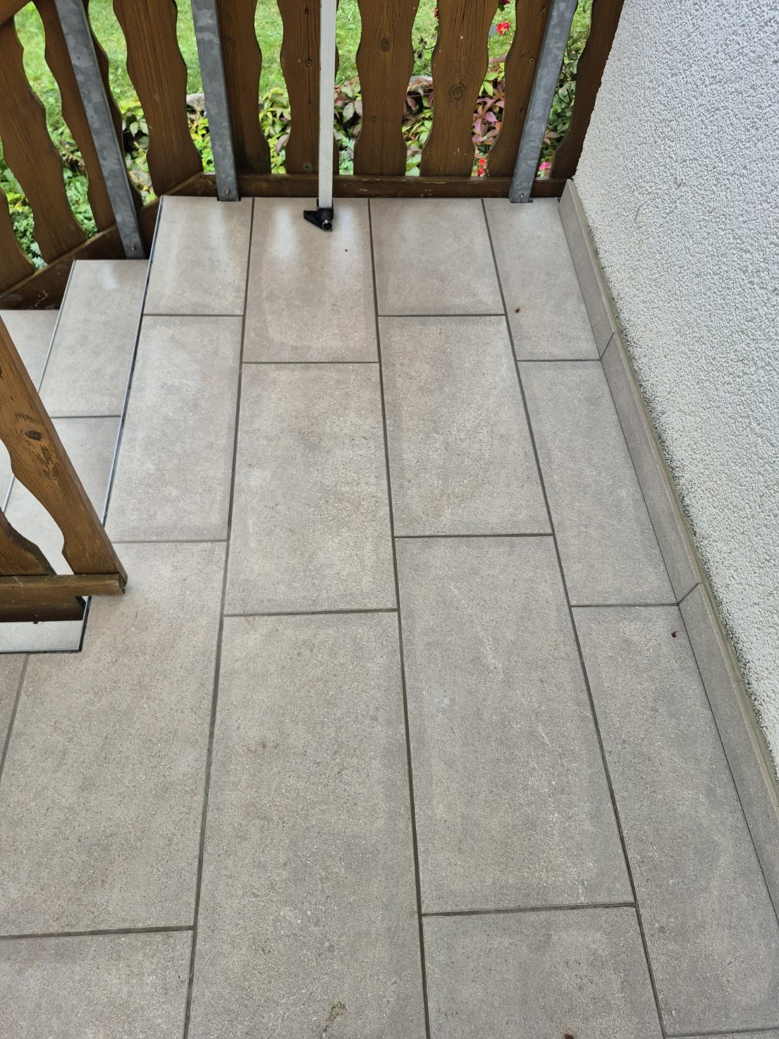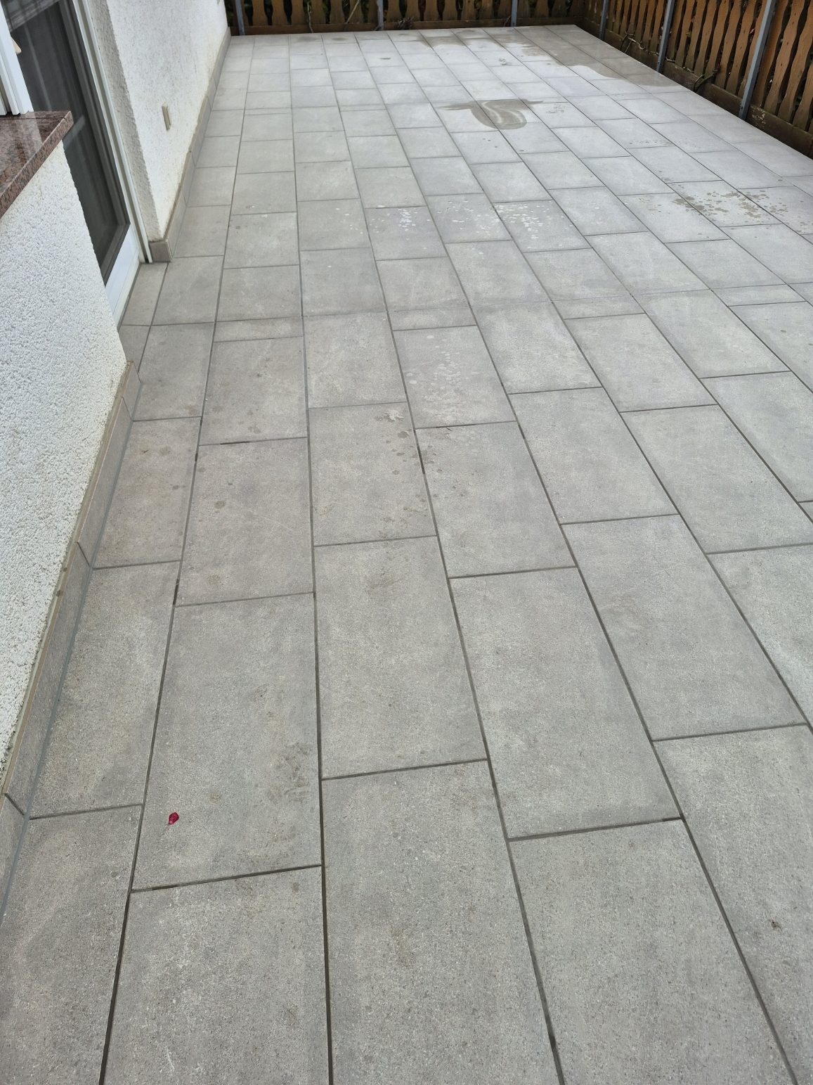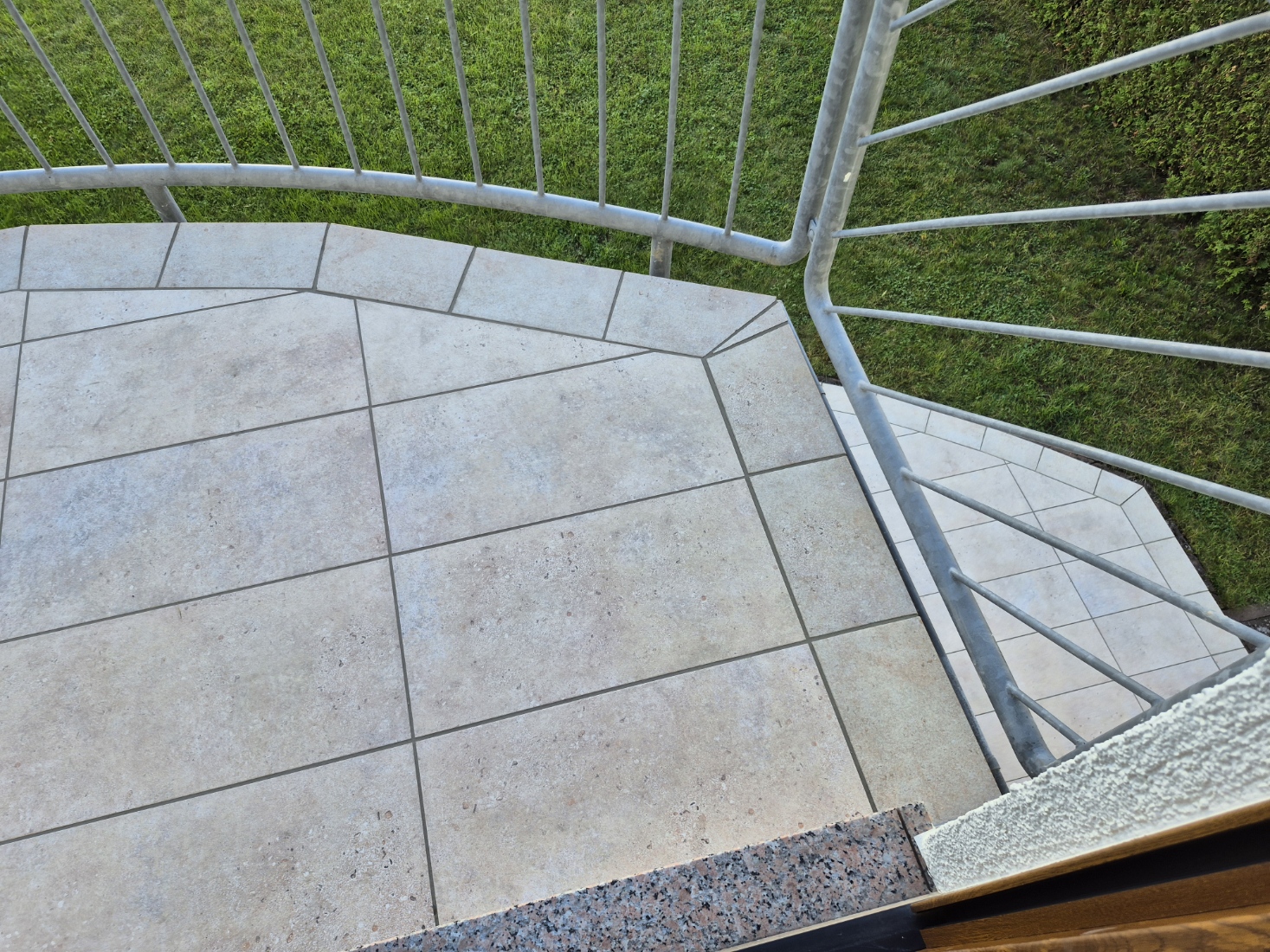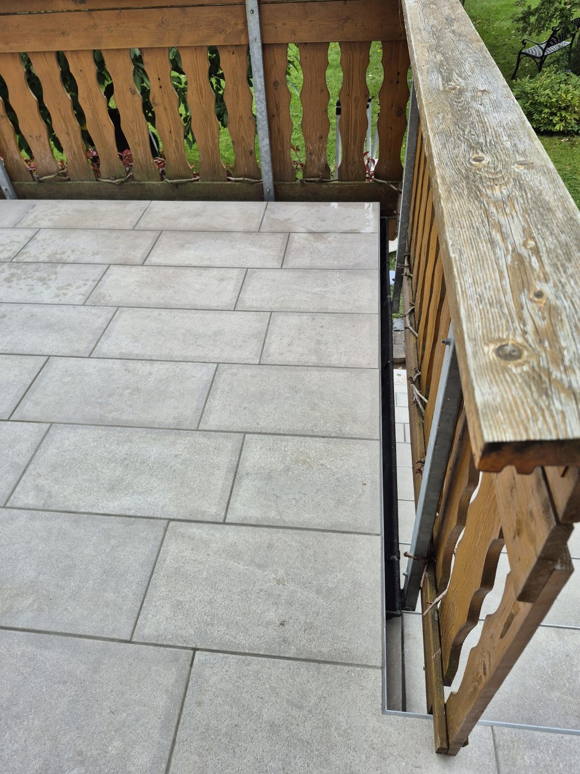 Die Terrassen haben einen Estrich verlegt bekommen mit einem Gefälle von 1,5% zur Abschlussschiene, über dem Estrich wurde eine Feuchtigkeitsabdichtung aufgetragen und im nächsten Arbeitsschritt wurde eine Drainagematte ausgelegt und zugeschnitten, die Platten wurden in Dünnbettmörtel direckt auf den Drainagenmatten geklebt. Der Anschluss den den Aluschienen wurde mit Silicon Abgedichtet.