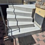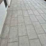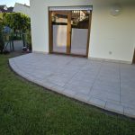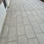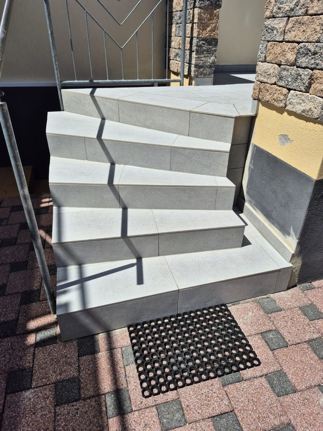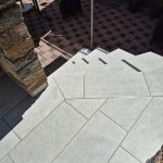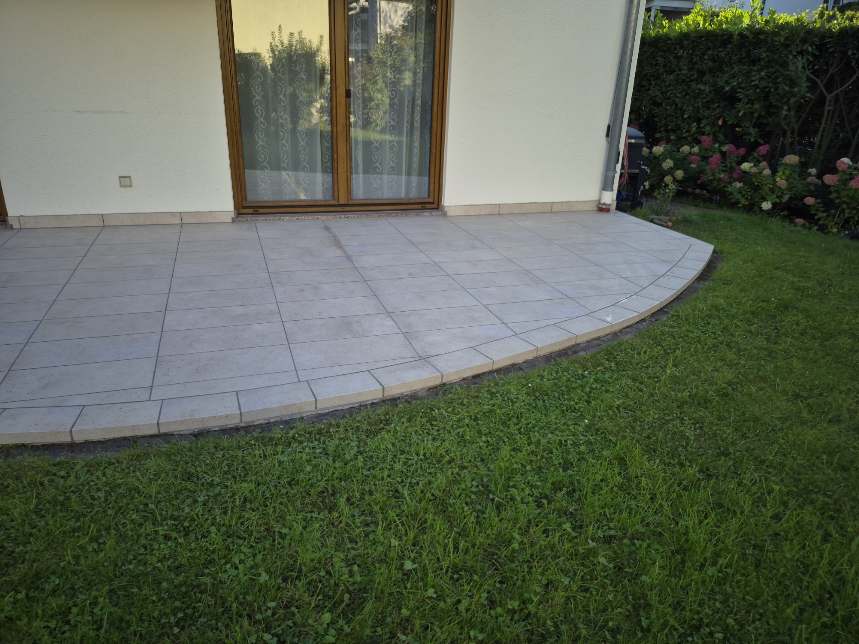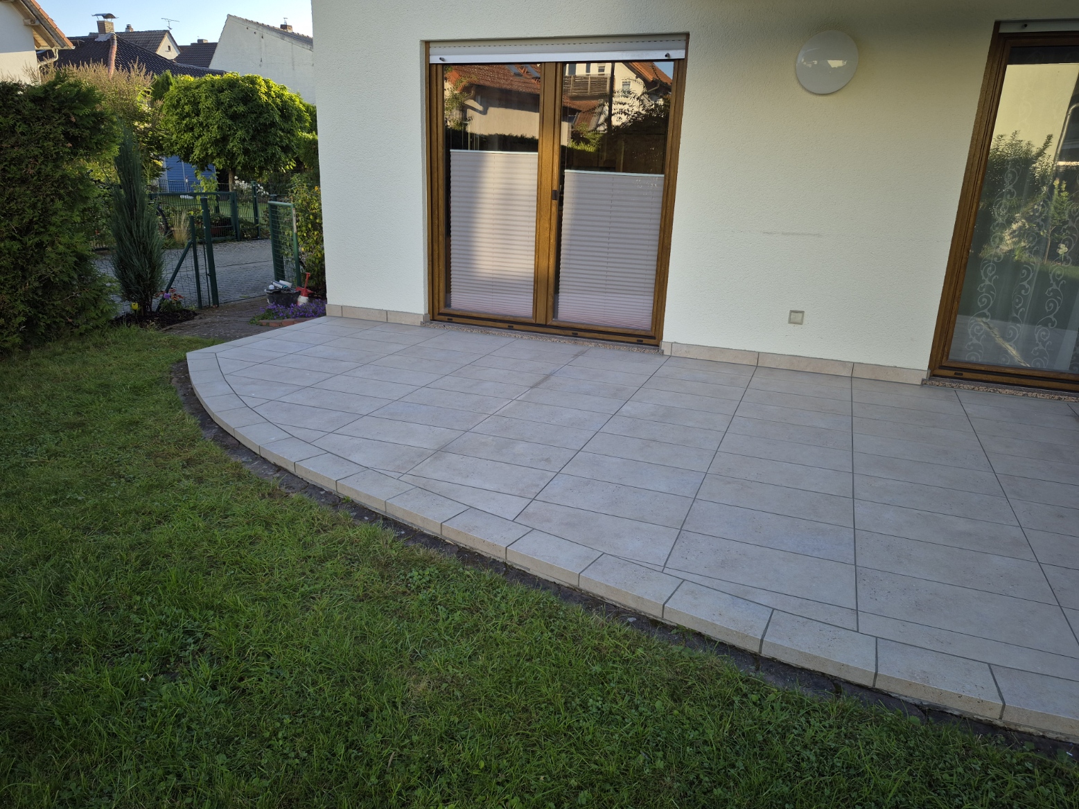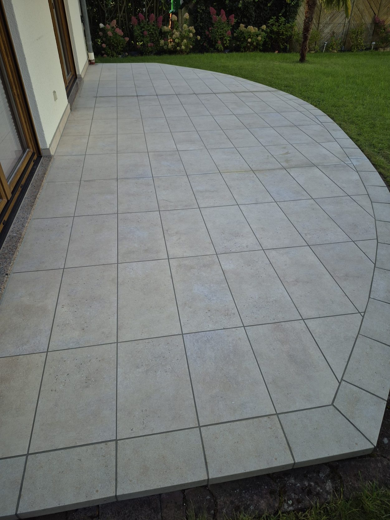 Die Terrassen haben einen Estrich verlegt bekommen mit einem Gefälle von 1,5% zur Abschlussschiene, über dem Estrich wurde eine Feuchtigkeitsabdichtung aufgetragen und im nächsten Arbeitsschritt wurde eine Drainagematte ausgelegt und zugeschnitten, die Platten wurden in Dünnbettmörtel direckt auf den Drainagenmatten geklebt. Der Anschluss den den Aluschienen wurde mit Silicon Abgedichtet.